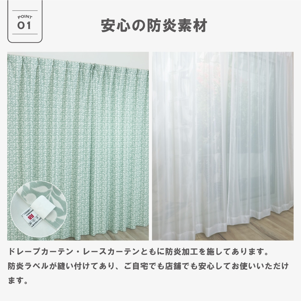 昼間は外から見えにくい、ミラー機能付きで無地の防炎レースカーテンのセットになります。
