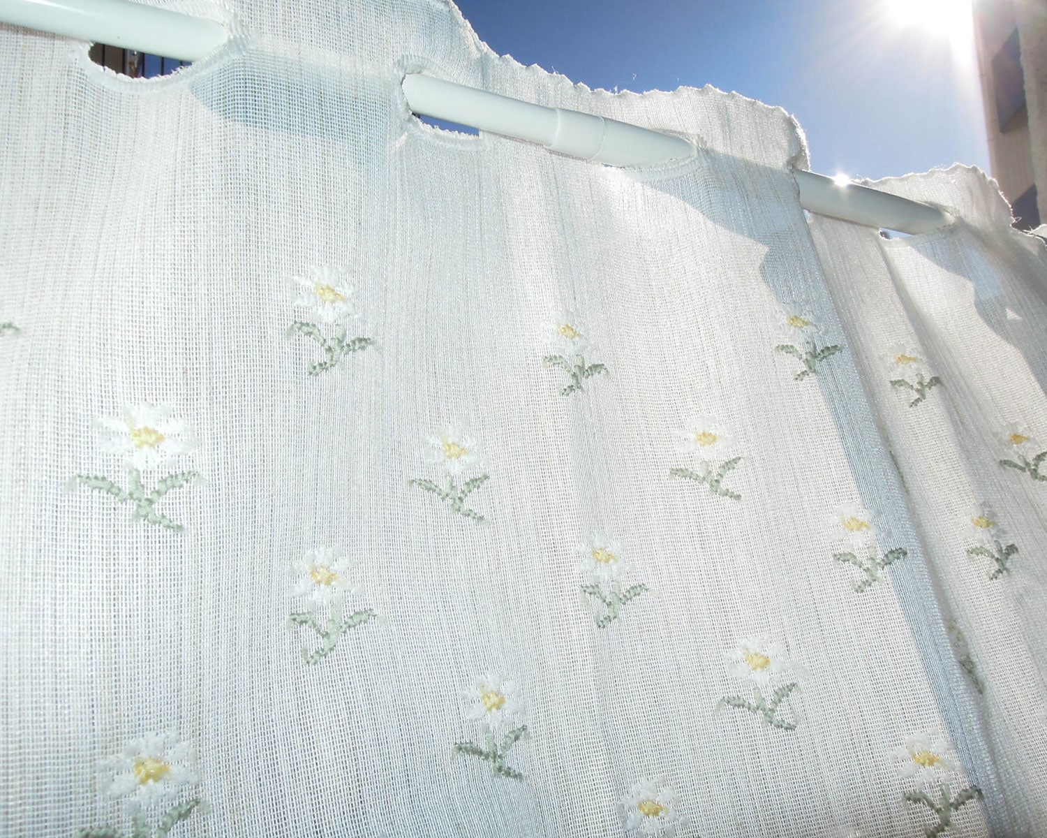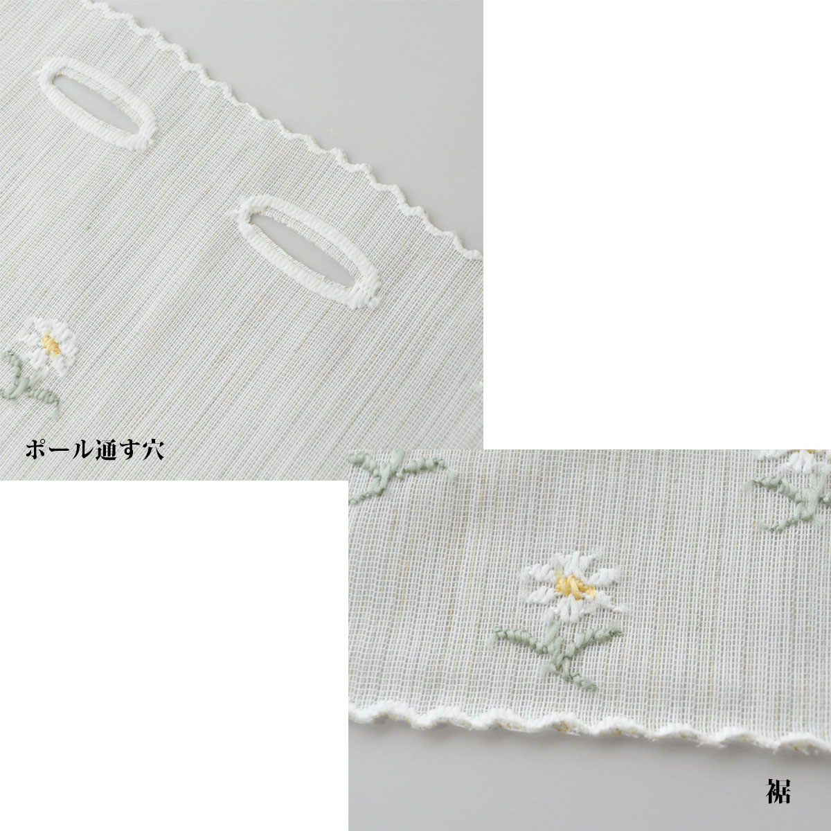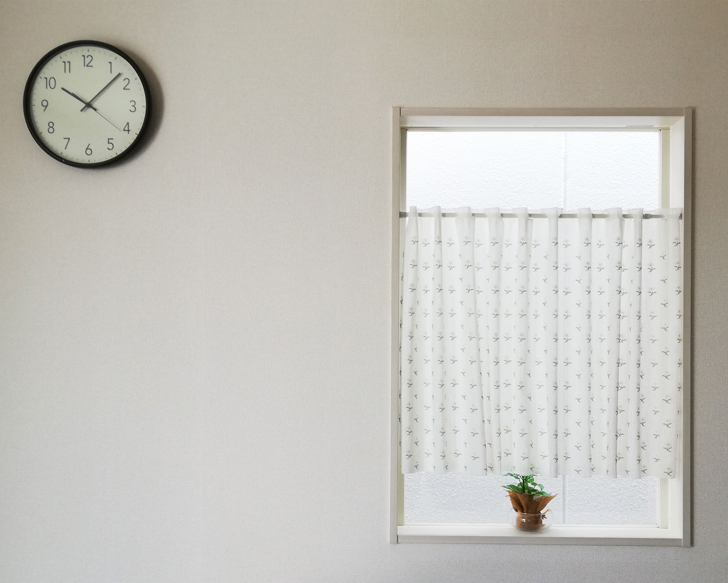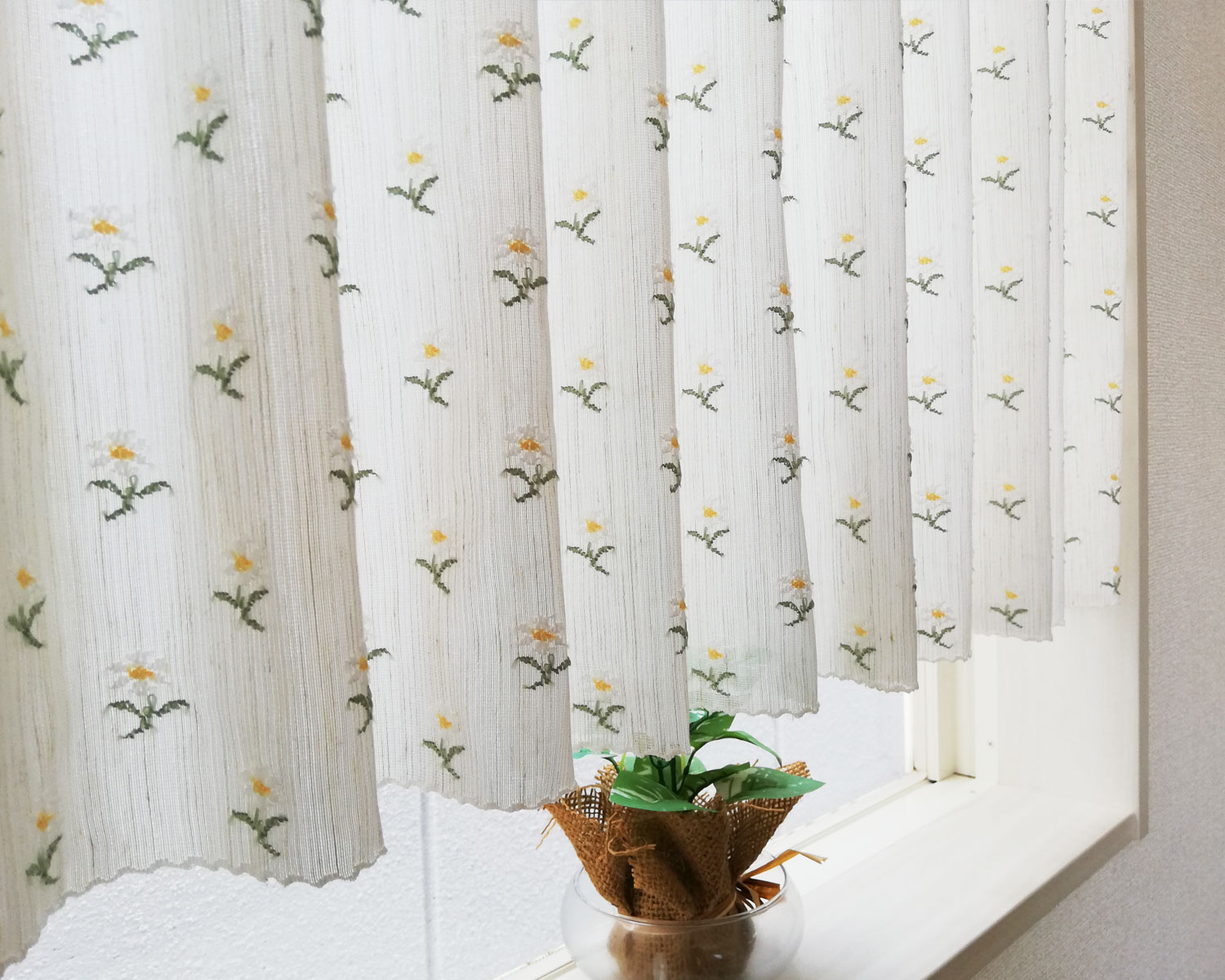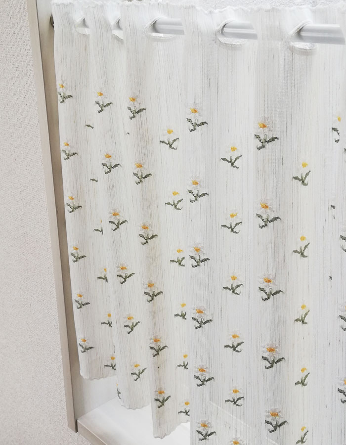 光を優しく取り込む透け感と刺繍のような小花柄のカフェカーテン。