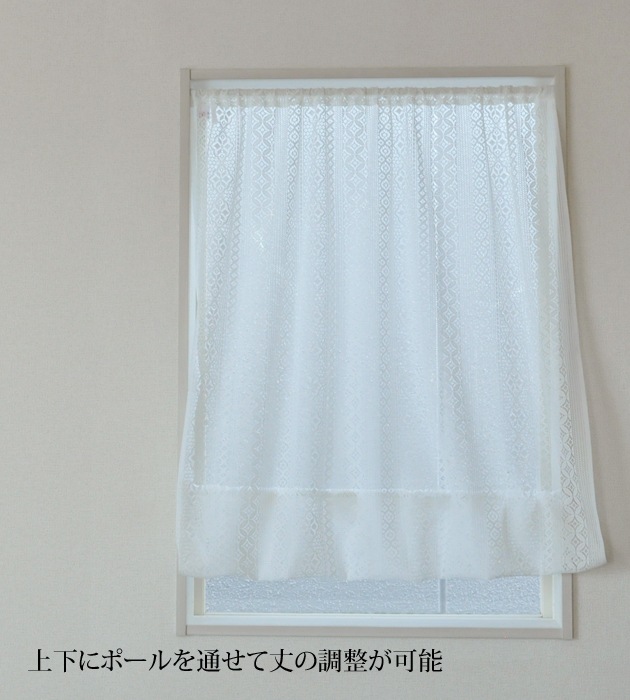 小窓カーテンは上と下と両方にポールが通せるようになっており、下のポールを上下することで丈の調整が可能。